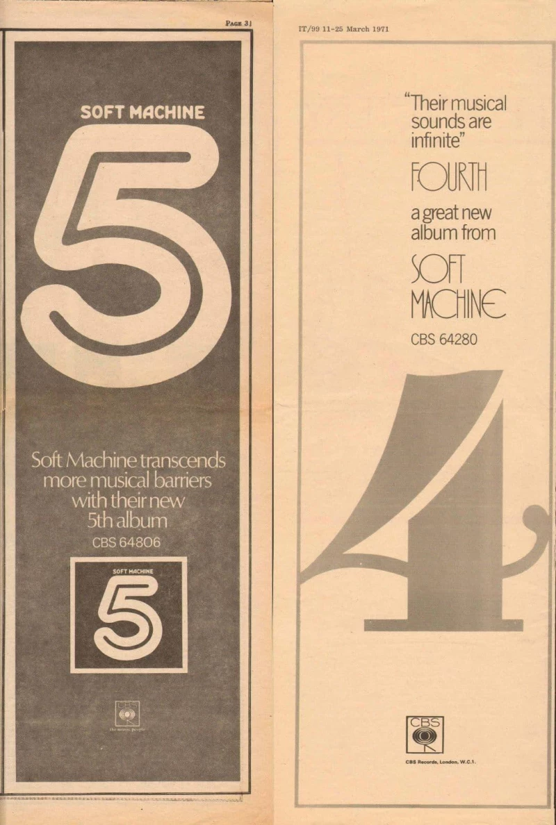 2x SOFT MACHINE 4 & 5 Poster Size Press Adverts/Cuttings from 1973 and 1972. Very Good condition. . Size A3 Approx 16½" X 5½" ( 42x15cm )