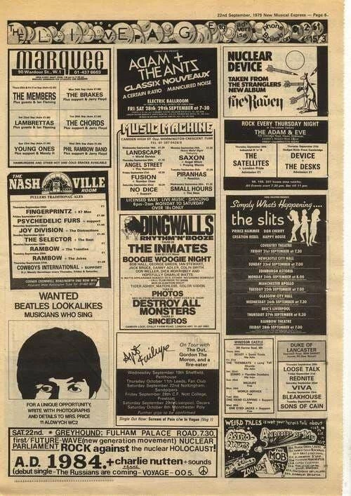 ADAM + THE ANTS SLITS Joy Division Poster size Advert/Clipping/Cutting 1979. Original Newspaper Print - Vg+ condition with some creasing as seen. Overseas buyers can buy up to 20 cuttings and only pay postage for one item. Size A3 Approx 16" X 12" (42 X 30cm)