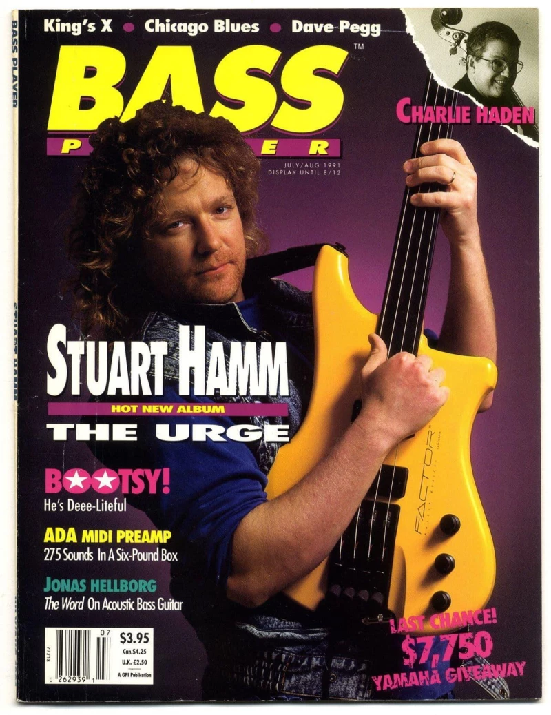 Bass Player Magazine back issue Jul/Aug 1991 features articles on Dave Pegg, Charlie Haden, Stuart Hamm, Bootsy & more.