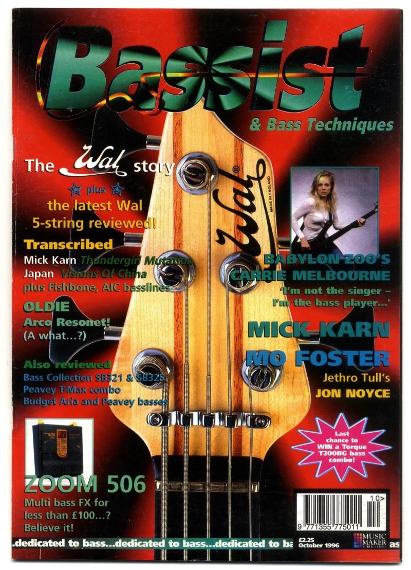 Bassist Guitar Magazine back issue October 1996 featuring Japan's Mick Karn, Mo Foster, Jethro Tull's Jon Noyce and regular features Equipment reviews, Letters, Workshop, Advanced Techniques.