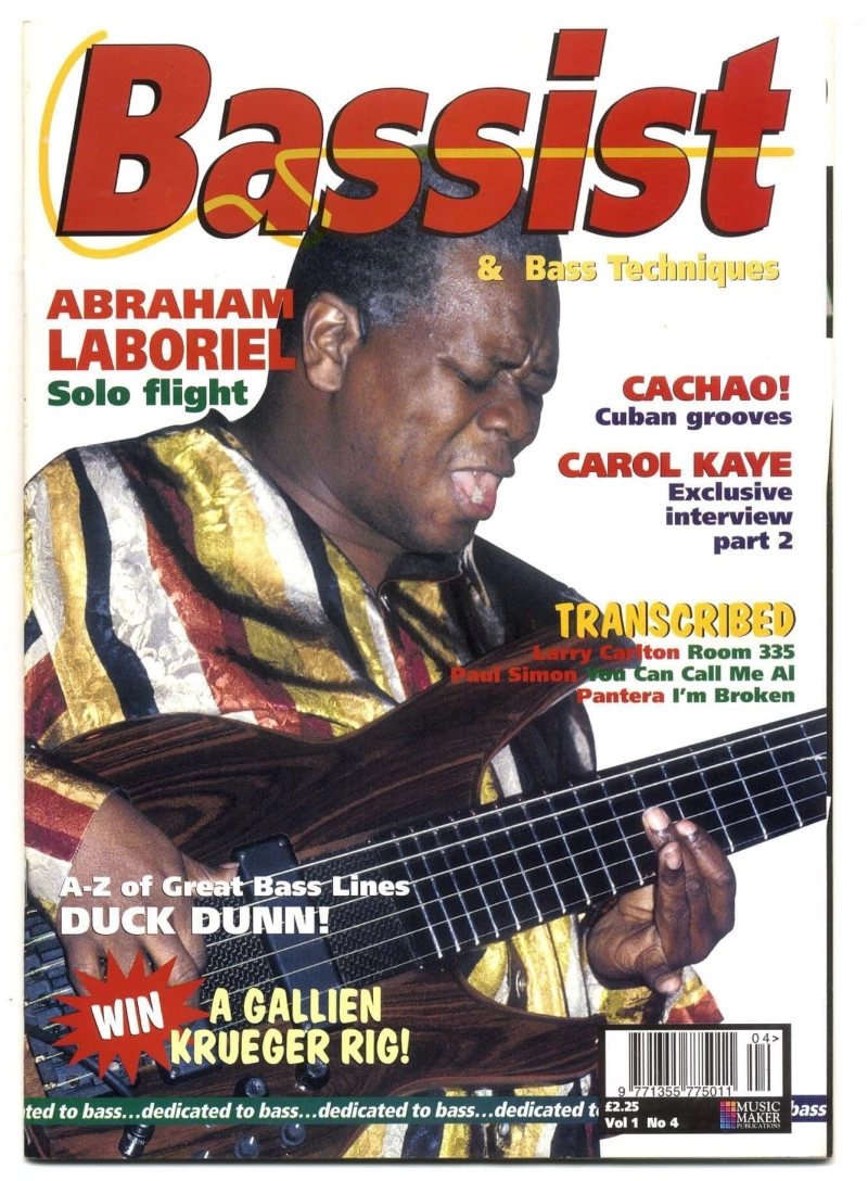 Bassist Guitar Magazine back issue Vol 1 #4 features Abraham Laboriel, Duck Dunn, Carol Kaye, Pantera and regular features Equipment reviews, Letters, Workshop, Advanced Techniques, Bassist magazine - Making you a better Bass Player. Bassist magazine is published by Future Publishing, 30 Monmouth Street, Bath BA1 2BW Editor Roger Newell.
