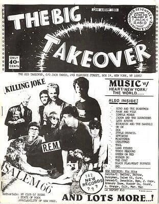 The Big Takeover is a bi-annual music mag published in New York City since 1980 by critic Jack Rabid. Jack Rabid and Dave Stein began publishing the Big Takeover as a fanzine dedicated to New York punk band The Stimulators. The title of the fanzine was borrowed from Bad Brains. The very first issue was just one A4 page, front and back, printed from copy machines and given out for free at local punk gigs. Stein left the fanzine to Rabid after one issue and Rabid has remained the dominant creative force behind the magazine since. The Big Takeover moved from one page to a few pages & then to a slightly less primitive fanzine style to the black-and-white, stapled magazine style around issue 26 in 1989. During this period, Rabid worked during the day and was still doing most of the writing, all the layout and advertising sales. Other notable contributors to the magazine in the early days included former MTV personality Tim Sommer. During the first half of the 1990s, The Big Takeover began using professional layout design and by the end of the decade had become a semi-glossy, color magazine. Circulation is currently around 15,000