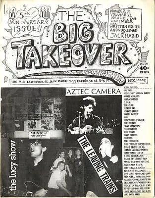 The Big Takeover is a bi-annual music mag published in New York City since 1980 by critic Jack Rabid. Jack Rabid and Dave Stein began publishing the Big Takeover as a fanzine dedicated to New York punk band The Stimulators. The title of the fanzine was borrowed from Bad Brains. The very first issue was just one A4 page, front and back, printed from copy machines and given out for free at local punk gigs. Stein left the fanzine to Rabid after one issue and Rabid has remained the dominant creative force behind the magazine since. The Big Takeover moved from one page to a few pages & then to a slightly less primitive fanzine style to the black-and-white, stapled magazine style around issue 26 in 1989. During this period, Rabid worked during the day and was still doing most of the writing, all the layout and advertising sales. Other notable contributors to the magazine in the early days included former MTV personality Tim Sommer. During the first half of the 1990s, The Big Takeover began using professional layout design and by the end of the decade had become a semi-glossy, color magazine. Circulation is currently around 15,000