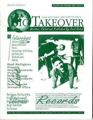The Big Takeover is a bi-annual music mag published in New York City since 1980 by critic Jack Rabid. Jack Rabid and Dave Stein began publishing the Big Takeover as a fanzine dedicated to New York punk band The Stimulators. The title of the fanzine was borrowed from Bad Brains. The very first issue was just one A4 page, front and back, printed from copy machines and given out for free at local punk gigs. Stein left the fanzine to Rabid after one issue and Rabid has remained the dominant creative force behind the magazine since. The Big Takeover moved from one page to a few pages & then to a slightly less primitive fanzine style to the black-and-white, stapled magazine style around issue 26 in 1989. During this period, Rabid worked during the day and was still doing most of the writing, all the layout and advertising sales. Other notable contributors to the magazine in the early days included former MTV personality Tim Sommer. During the first half of the 1990s, The Big Takeover began using professional layout design and by the end of the decade had become a semi-glossy, color magazine. Circulation is currently around 15,000