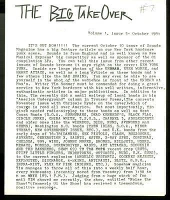 The Big Takeover is a bi-annual music mag published in New York City since 1980 by critic Jack Rabid. Jack Rabid and Dave Stein began publishing the Big Takeover as a fanzine dedicated to New York punk band The Stimulators. The title of the fanzine was borrowed from Bad Brains. The very first issue was just one A4 page, front and back, printed from copy machines and given out for free at local punk gigs. Stein left the fanzine to Rabid after one issue and Rabid has remained the dominant creative force behind the magazine since. The Big Takeover moved from one page to a few pages & then to a slightly less primitive fanzine style to the black-and-white, stapled magazine style around issue 26 in 1989. During this period, Rabid worked during the day and was still doing most of the writing, all the layout and advertising sales. Other notable contributors to the magazine in the early days included former MTV personality Tim Sommer. During the first half of the 1990s, The Big Takeover began using professional layout design and by the end of the decade had become a semi-glossy, color magazine. Circulation is currently around 15,000