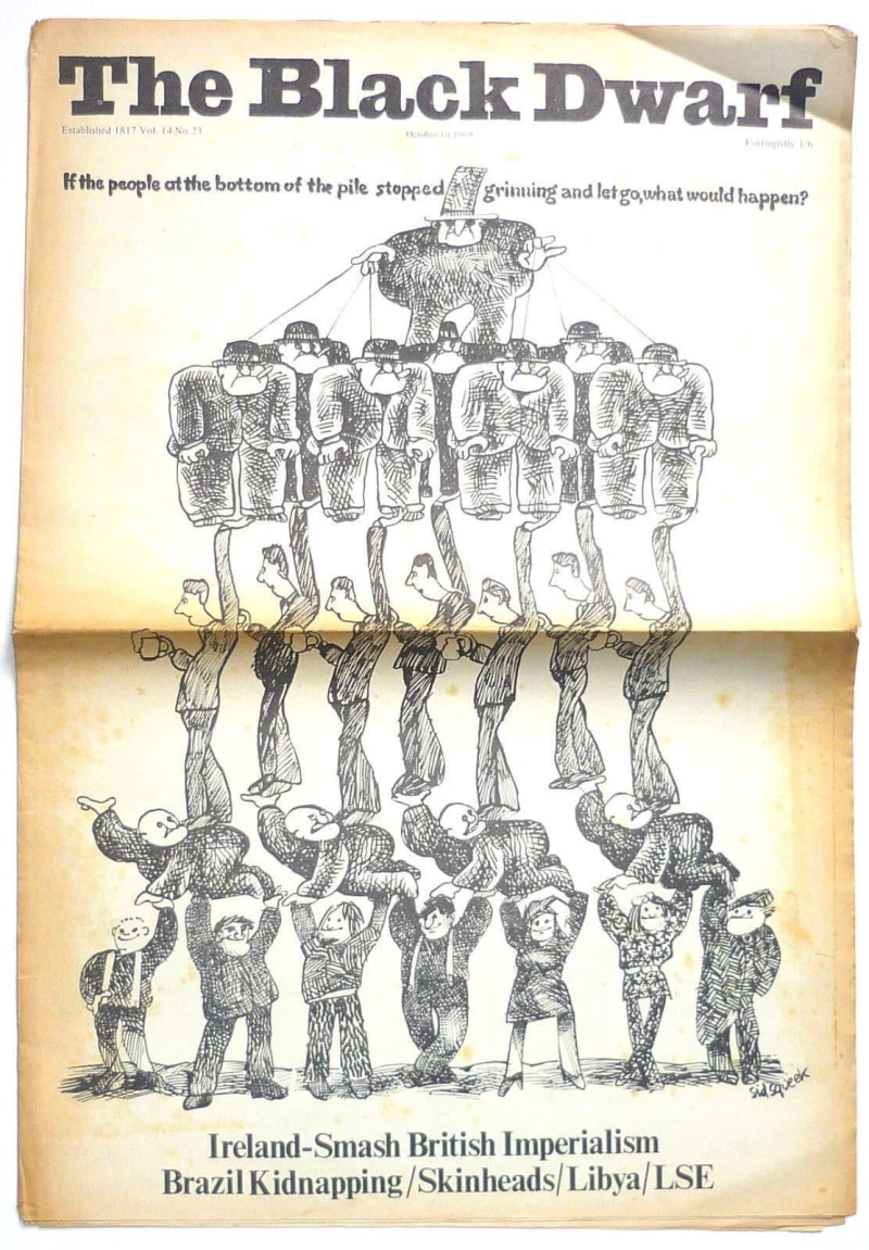 Black Dwarf Magazine 1 Oct 1969 No 23 Skinheads/Lybia/Ireland/Brazil kidnapping. Radical Politics UK Oz era magazine. Black Dwarf was published between May 1968 and 1972 by a collective of UK socialists. It was edited and published by Tariq Ali until 1970, when the editorial board split between Leninist and non-Leninist ideals. Editorial and Edit Production personel included Ali, Clive Goodwin, Mo Teitlebaum, Douglas Gill, Robin Fior, David Mercer, Adrian Mitchell, Bob Rowthorn, Sean Thompson, Roger Tyrrell, Sheila Rowbotham, and Fred Halliday. Black Dwarf got its name from the 19th century radical paper of that name which was first published in 1817.
