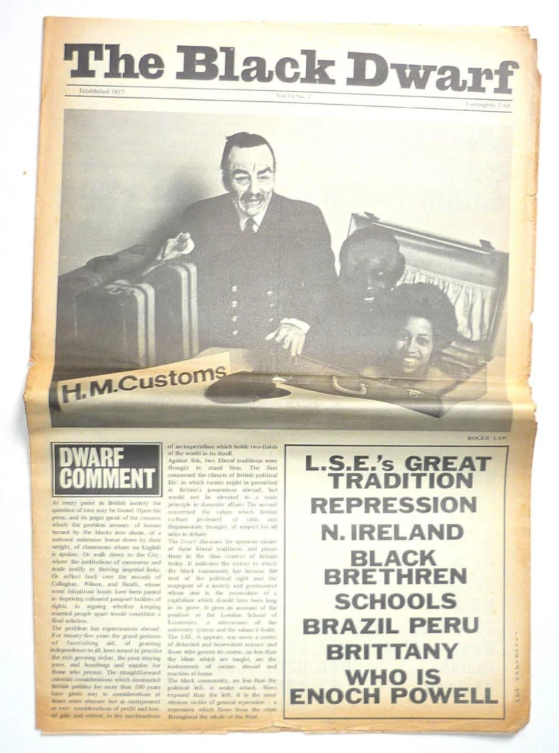 Black Dwarf Magazine 14 March 1969 Northen Ireland Racism Imperialism Enoch Powell. Radical Politics UK Oz era magazine. Black Dwarf was published between May 1968 and 1972 by a collective of UK socialists. It was edited and published by Tariq Ali until 1970, when the editorial board split between Leninist and non-Leninist ideals. Editorial and Edit Production personel included Ali, Clive Goodwin, Mo Teitlebaum, Douglas Gill, Robin Fior, David Mercer, Adrian Mitchell, Bob Rowthorn, Sean Thompson, Roger Tyrrell, Sheila Rowbotham, and Fred Halliday. Black Dwarf got its name from the 19th century radical paper of that name which was first published in 1817.