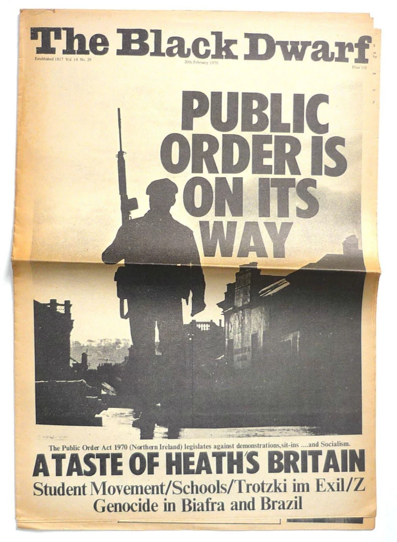 Black Dwarf Magazine 20 Feb No 29 1970 A taste of Heath's Britain - Public order act/Northern Ireland/Trotzki im exil, Genocide in Biafra. Radical Politics UK Oz era magazine. Black Dwarf was published between May 1968 and 1972 by a collective of UK socialists. It was edited and published by Tariq Ali until 1970, when the editorial board split between Leninist and non-Leninist ideals. Editorial and Edit Production personel included Ali, Clive Goodwin, Mo Teitlebaum, Douglas Gill, Robin Fior, David Mercer, Adrian Mitchell, Bob Rowthorn, Sean Thompson, Roger Tyrrell, Sheila Rowbotham, and Fred Halliday. Black Dwarf got its name from the 19th century radical paper of that name which was first published in 1817.