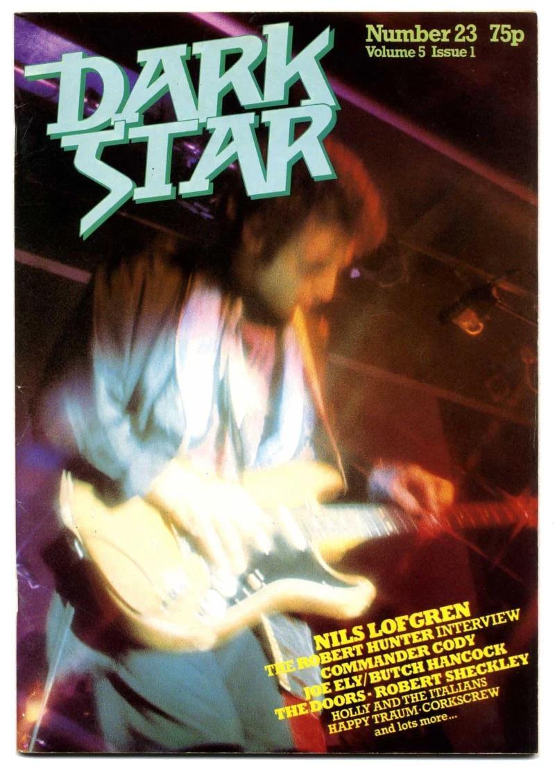 Dark Star Magazine No 23 April 1980 The Doors, Nils Lofgren, Joe Ely, Robert Hunter interview, Commander Cody, Robert Sheckley and other regular features including record reviews and music news mostly from the American music scene. Dark Star Publishers were Mike Bushill, and Nick Ralph, Editor: Steve Burgess. Dark Star magazine was based in Middlesex UK.