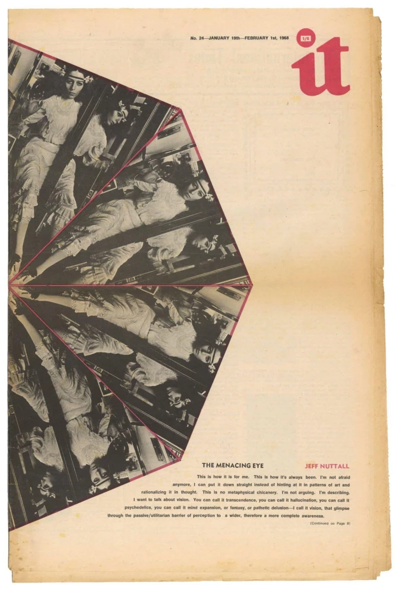 it or International Times magazine/newspaper No 24 Jan 19th - Feb 1st 1968: fold-out refracted cover of IT girl; The Menacing Eye by Jeff Nuttall 2 pages of supreme autobiographical rant; Guest Editorial Phil Parsons; Cuba, Belgium, Paris round-ups;Interview with Fritz Teufel; Berlin round-up; Rare Interview with Roy Lichtenstein; John Peel's Perfumed Garden; Alex Gross; Londons Anti-University announces courses; Gary Snyder; KNOKKE - Experimental Film Festival report from Belgium; Unicorn Bookshop raided; Folk Festival at Royal Albert Hall, The Watersons / Incredible String Band / Al Stewart/ Roy Harper...Ad: Bristol Arts Centre