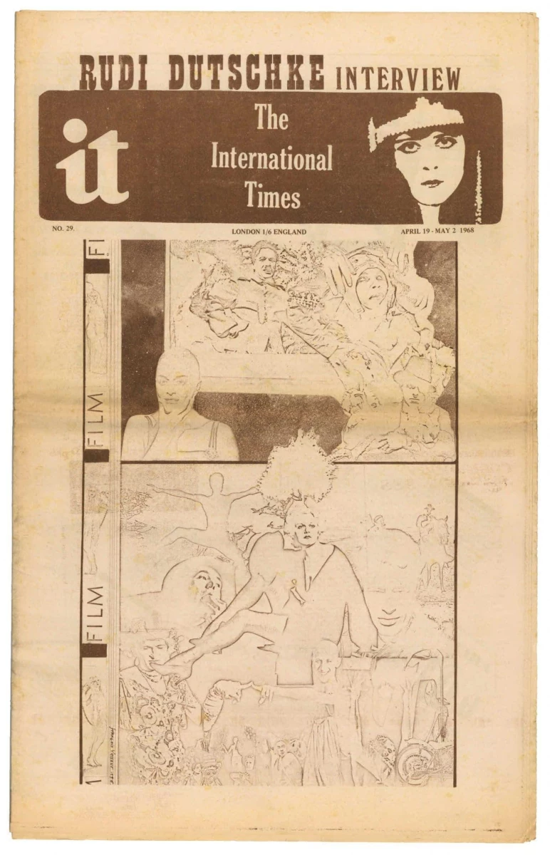 it or International Times magazine/newspaper 29 April 19th May 2nd 1968: Cover art by Francis Vasseur. Interview with Rudi Dutschke the German revolutionary, before his attempted assassination; Victory Thru Vegetables by Greg Sams; UFO is Dead analysis of the demise of the venue of the UFO club including graphic display of the origin of user; large feature on Londons ARTS LAB and especially film, including interviews, opinion etc...Open letter to Tariq Ali from John Hopkins; letter to IT from Mick Farren; Adverts for Captain Beefheart, The Deviants, Uriel, Brian Auger Trinity with Julie Driscoll, Audience, Tintagel, Ike and Tina Turner, Thackeray, Owen Russell Blues Band, Fairport Convention, Tangerine Slyde, Ginger Johnson, Soft Machine, People Show, King Ida's Watch Chain & Memphis Leather at Middle Earth.
