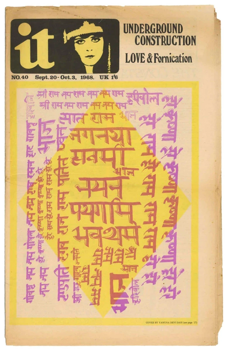 it or International Times magazine/newspaper No 40 September 20th - October 3rd 1968: cover is a "transcendental sound vibration" or mantra designed by Yamuna Devi Dasi; Underground Construction - Emmanuel Petrakis; Love and Fornication, 3-part series Theodore Faithfull (Mariannes father..); Principal Edwards Magic Theatre design centre spread; The Fugs; report from Melbourne, Australia; Jefferson Airplane; Apple Blossoms -Reviews Of The First Four Singles including Hey Jude; "Black Power or Death" an excerpted speech by Obi Egbuna of Britain's Black Panthers who was "charged in a London court with [uttering] a writing threatening to murder police officers"; back cover features a cartoon exhorting the use of psychedelics "Play with your cells and become your own food!".