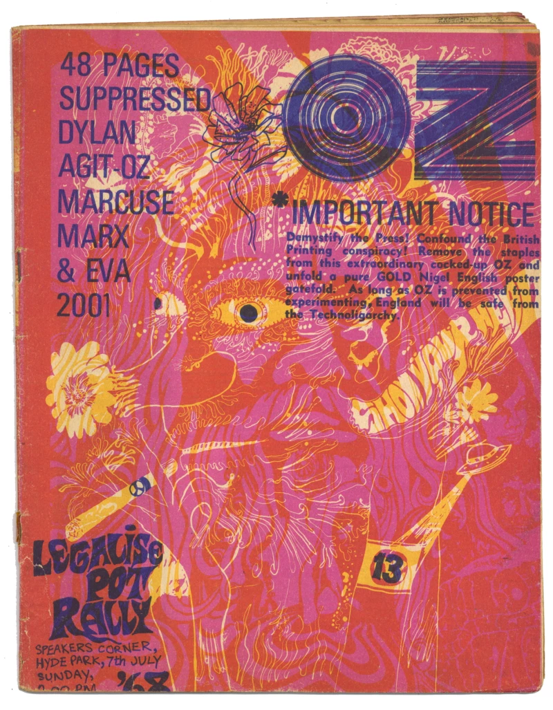 OZ Magazine No 13 June 1968 without poster. Martin Sharp Legalise Pot Rally graphic on cover. Minus poster cover