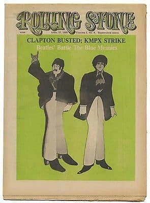ROLLING STONE 27th April 1968 Beatles battle Blue meanies, Traffic 2 pages, Byrds full page, Zappa article, Moby Grape full page article, Clapton Busted. Vintage Back Issue Magazine in Excellent condition aside from slight crease to edge near top seen in first pic. It would be hard to find a better preserved copy than this one - has been archive stored folded. If condition is crucial ask questions and view the uploaded pictures before you purchase. This issue will be shipped (folded) in a strong cardboard envelope
