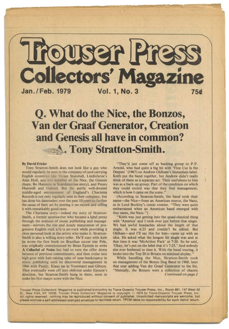 Trouser Press Collectors Magazine Jan/Feb 1979 Charisma records Tony Stratton-Smith